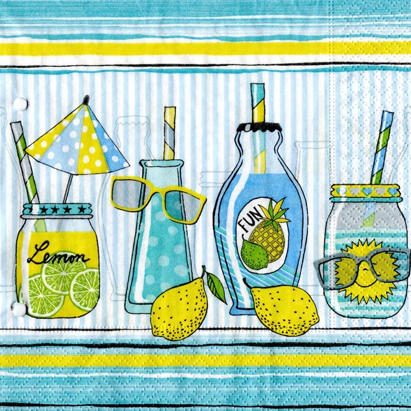 3φυλλη χαρτοπετσέτα 33 X 33 με θέμα "Λεμονάδα" ιδανική για Decoupage και κατασκευές.*Το προϊόν είναι δείγμα. Στην πίσω όψη υπάρχουν αυτοκόλλητα και στο πλάι δυο μικρές τρύπες.