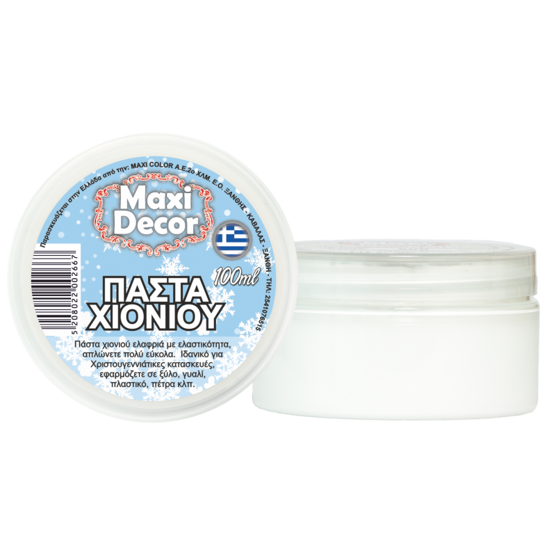 Πάστα χιονιού 100 ml ελαφριά, με ελαστικότητα η οποία απλώνεται πολύ εύκολα. Είναι ιδανική για Χριστουγεννιάτικες κατασκευές. Έχει πρόσφυση ακόμη και στις πιο δύσκολες επιφάνειες όπως